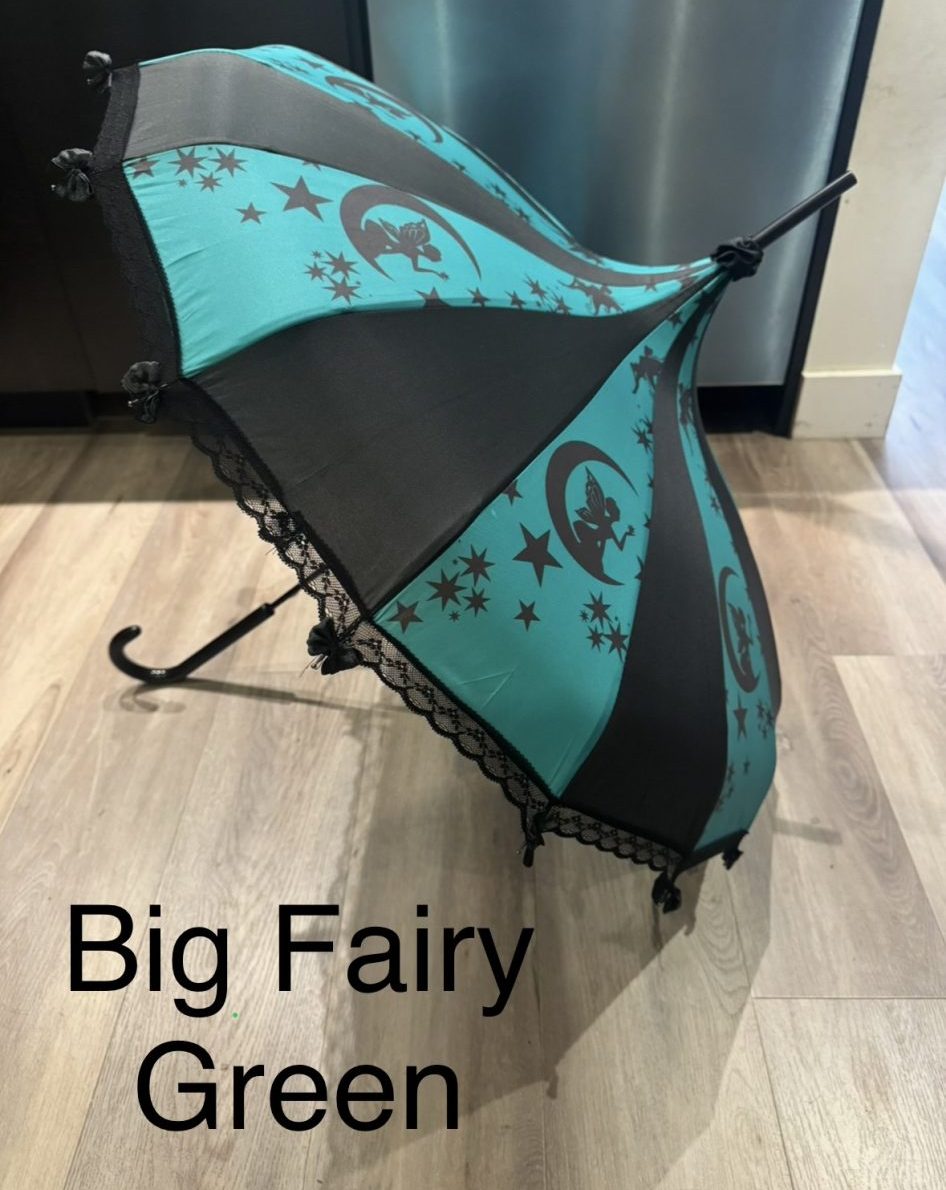 Black and Green Fairy parasol/umbrella This parasol is a fun and functional accessory. It shields you from sun and rain with its metal frame and waterproof fabric. It has a pagoda shape, a hooked handle, and a lace trim with bows. It comes in different themes to match your style. It is sturdy and portable, making it a smart and beautiful choice.