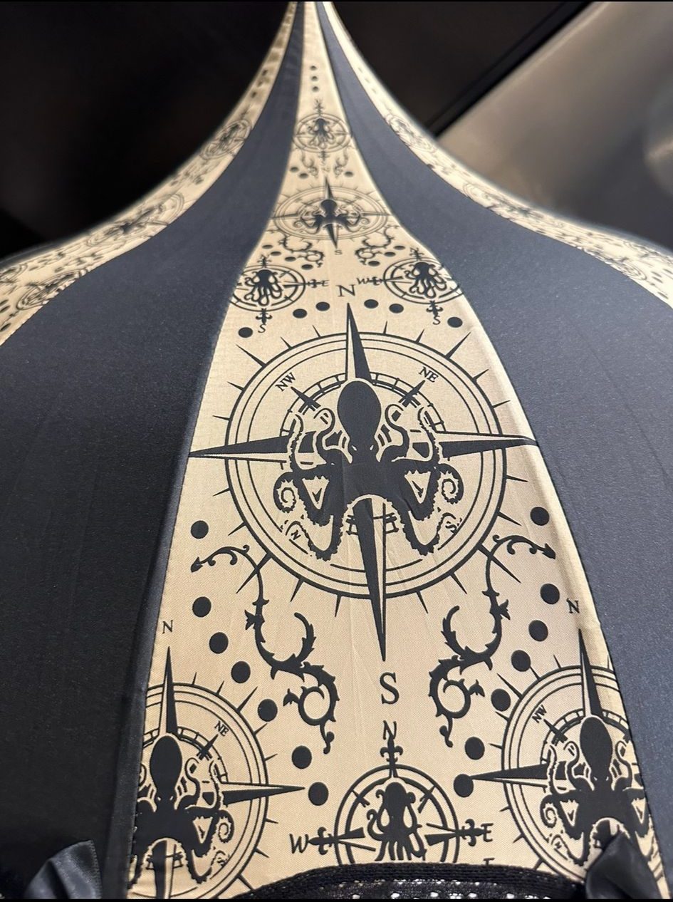 Oh, what a splendid sight to behold! This magnificent black and tan umbrella, adorned with a striking Black Octopus and compass pattern and delicate lace and bow details, complete with a sturdy hook-style handle. A true must-have accessory for any Victorian gentleman or lady, capable of braving any weather condition, be it the bright sun or the pouring rain. Do not be fooled, dear reader, for this is no mere fashion piece, but a practical and functional item that can protect one’s attire and keep one cool in the sun. And, how fitting it is for one to take this exceptional accessory to Renaissance Fairs and Dragon Con, among other such events. Truly, this is a remarkable and indispensable item, one that would make the late great HP Lovecraft proud.