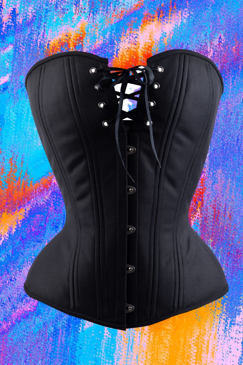 The outer layer of this corset is made from a solid black cashmere fabric.