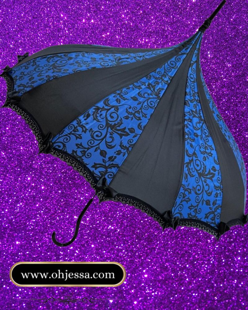 Blue Vine Parasol / Umbrella design… Rain or Shine! These beautiful parasols double as functional umbrellas. They will keep you shady on those bright sunny days and dry on those dark and stormy nights. The retro pagoda shape, hooked handle and lace trim with tiny bows at each point make these umbrellas perfect for a Victorian costume or a fashion accessory that is sure to be admired everywhere you go. Each one is creatively themed, so it may be hard to choose just one!