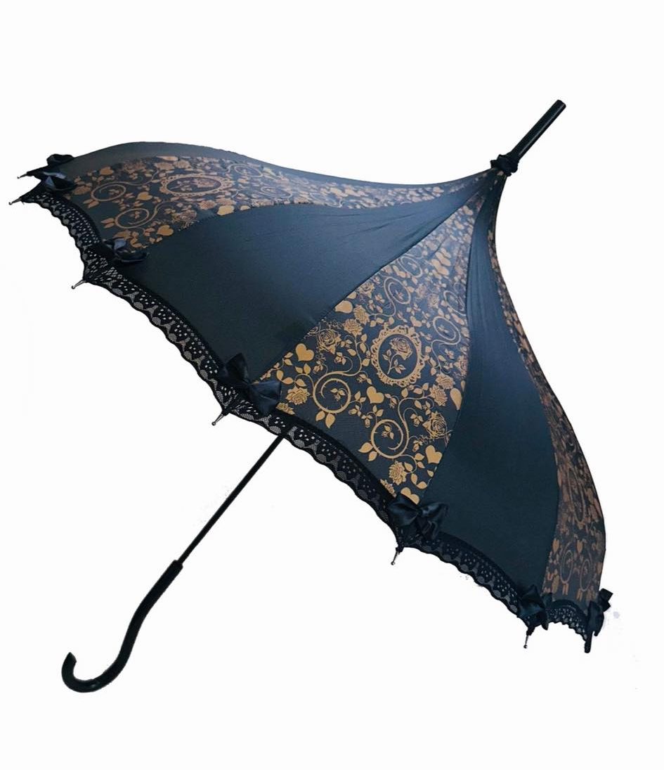 Copper Rose Parasol / Umbrella design… Rain or Shine! These beautiful parasols double as functional umbrellas. They will keep you shady on those bright sunny days and dry on those dark and stormy nights. The retro pagoda shape, hooked handle and lace trim with tiny bows at each point make these umbrellas perfect for a Victorian costume or a fashion accessory that is sure to be admired everywhere you go. Each one is creatively themed, so it may be hard to choose just one!