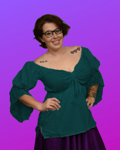 Women’s Cotton Renaissance Style Top with Lace sleeves. These lovely flowy tops have a cinch on the front that can turn it from a curved neckline to a V-neck in seconds