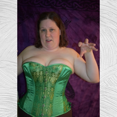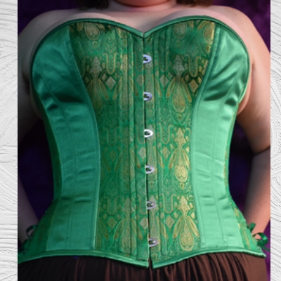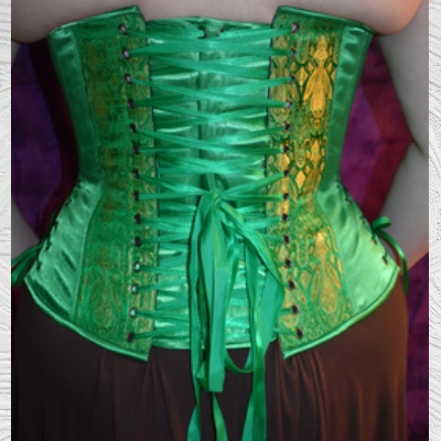 The outer layer of this corset is made from a silk brocade emerald/kelly green and gold fabric.