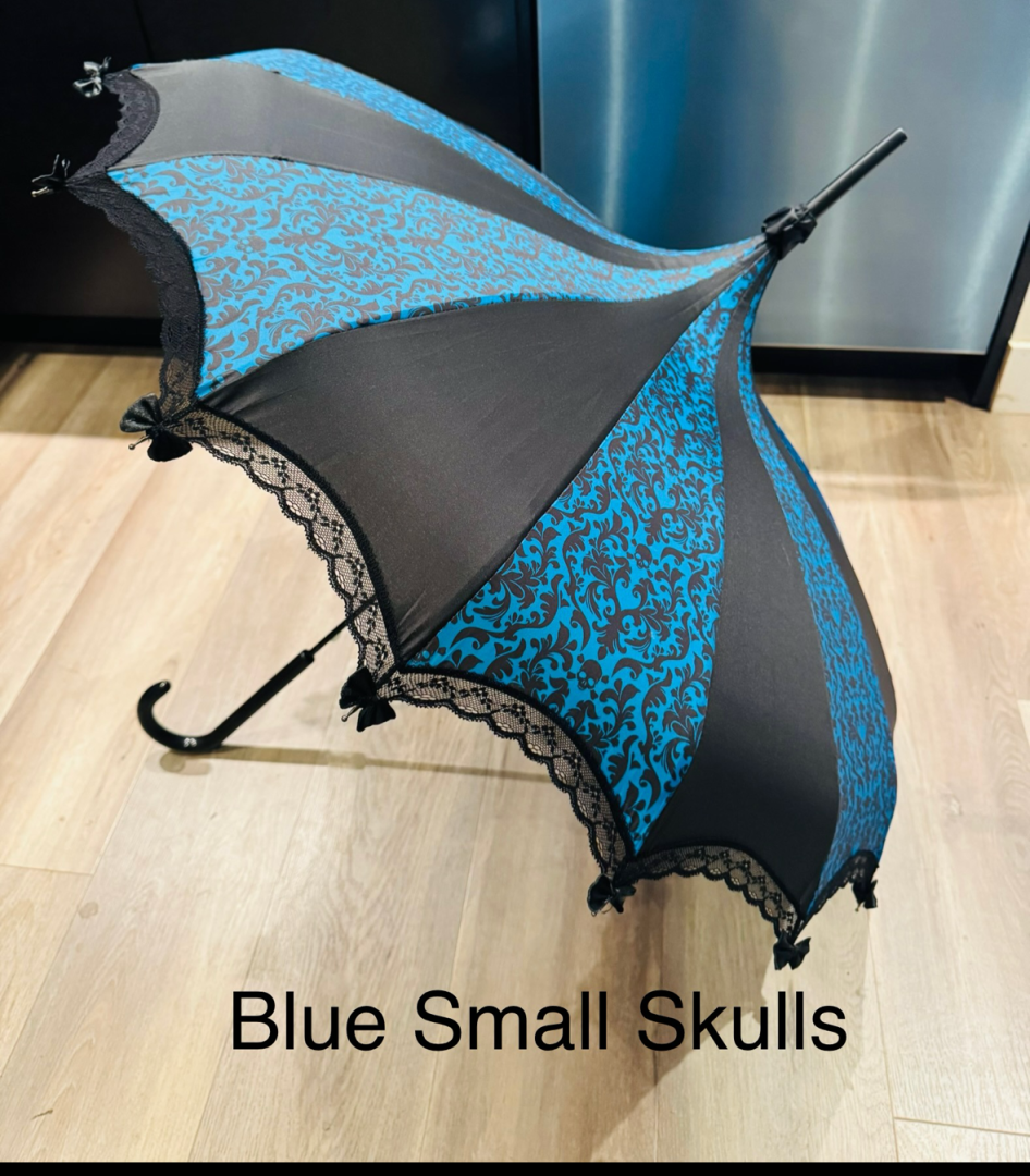 Fancy Blue Skull Parasol / Umbrella This parasol is a fun and functional accessory. It shields you from sun and rain with its metal frame and waterproof fabric. It has a pagoda shape, a hooked handle, and a lace trim with bows. It comes in different themes to match your style. It is sturdy and portable, making it a smart and beautiful choice.