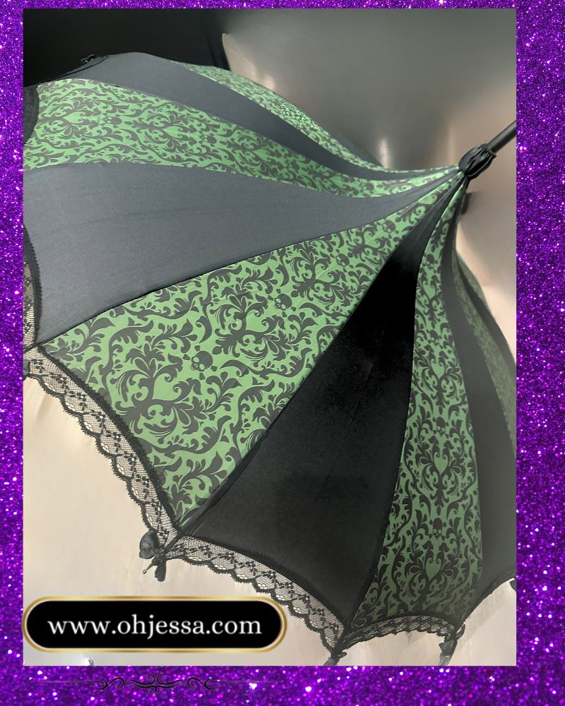 Fancy Green Skull Parasol This parasol is a fun and functional accessory. It shields you from sun and rain with its metal frame and waterproof fabric. It has a pagoda shape, a hooked handle, and a lace trim with bows. It comes in different themes to match your style. It is sturdy and portable, making it a smart and beautiful choice.