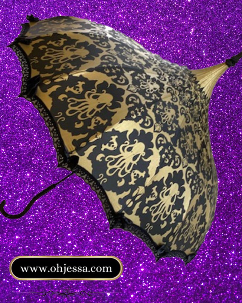 Ah, what a wondrous sight to behold! This beautiful black umbrella, adorned with a stunning golden Octopus pattern, complete with delicate lace and bow details and a sturdy hook-style handle. A must-have accessory for any Victorian gentleman or lady, capable of shielding one from the elements, whether it be the blazing sun or the pouring rain. Be not deceived, for this is no mere fashion statement, but a functional and practical item that can protect one’s attire and keep one cool under the sun’s scorching rays. It is a fitting addition to one’s wardrobe for Renaissance Fairs, Dragon Con, and other such events. A truly remarkable and indispensable item, one that would make the great HP Lovecraft proud.