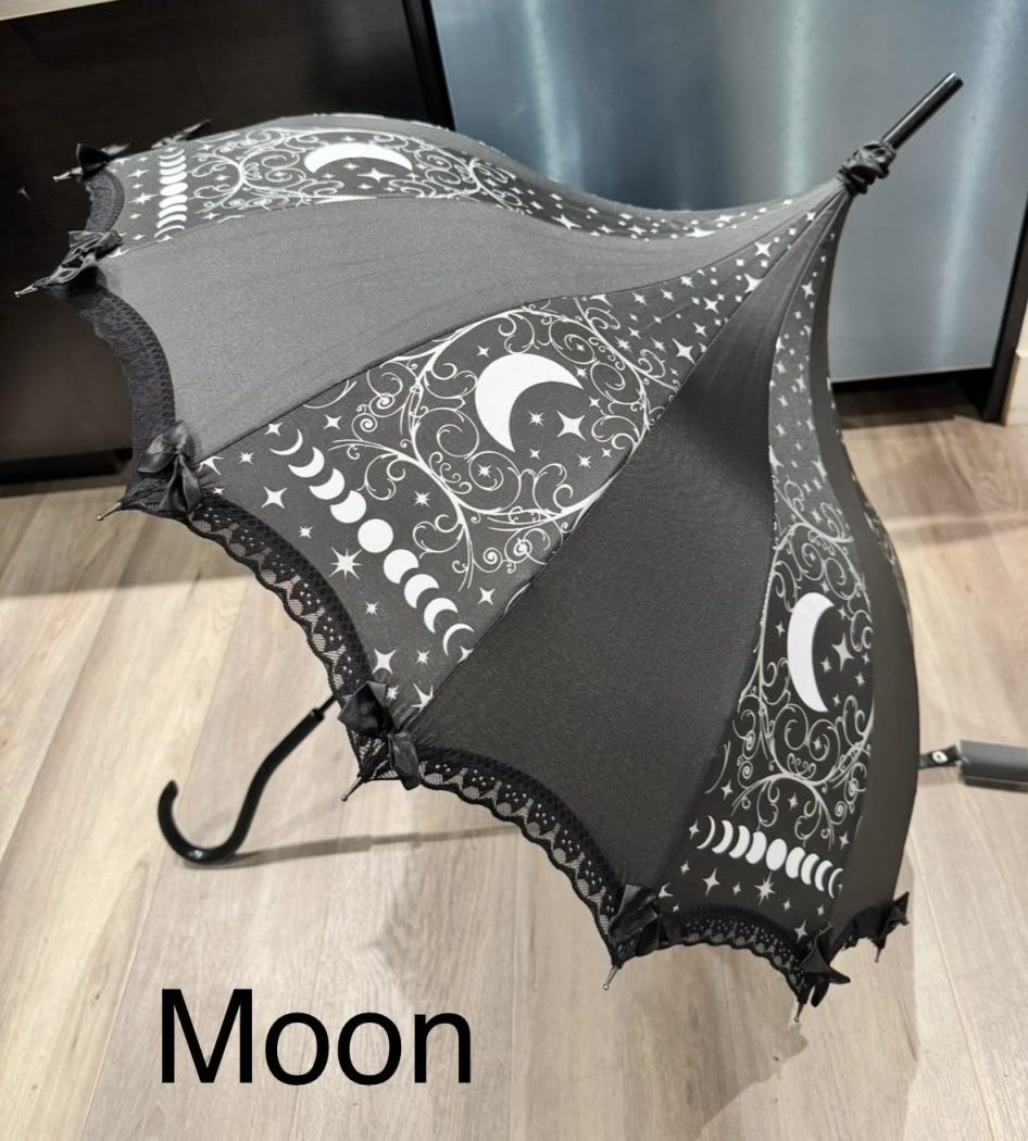 Moon parasol/umbrella Rain or Shine! These beautiful parasols double as functional umbrellas. They will keep you shady on those bright sunny days and dry on those dark and stormy nights. The retro pagoda shape, hooked handle and lace trim with tiny bows at each point make these umbrellas perfect for a Victorian costume or a fashion accessory that is sure to be admired everywhere you go. Each one is creatively themed, so it may be hard to choose just one!