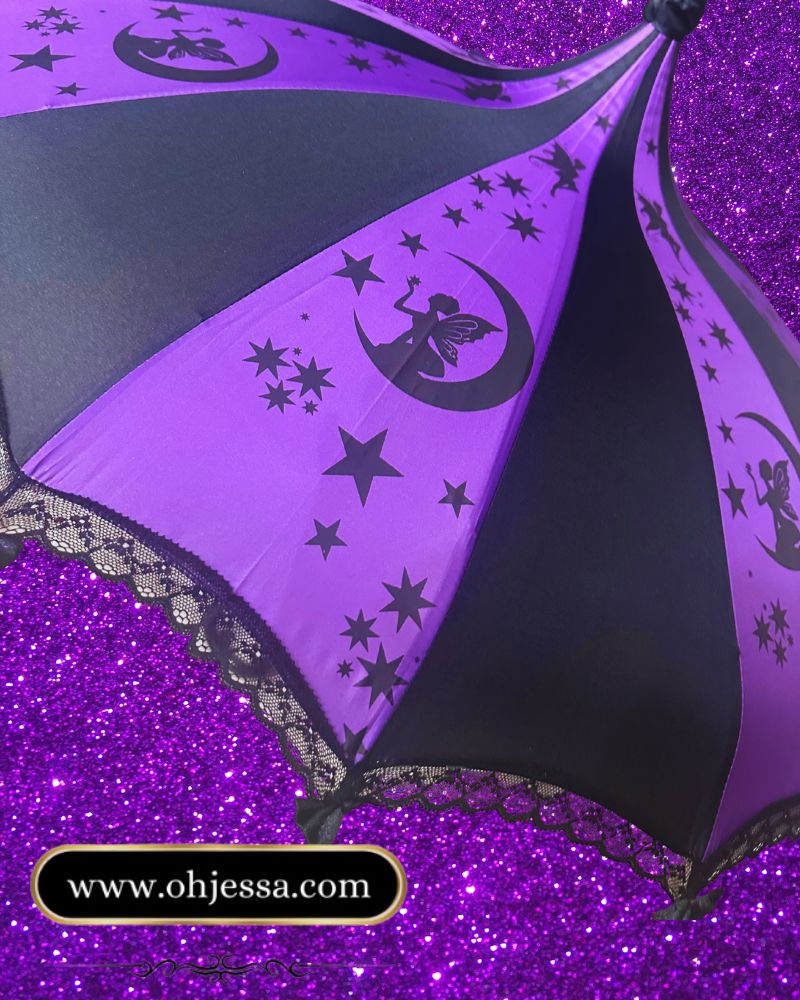 Purple Fairy Parasol / Umbrella Rain or Shine! These beautiful parasols double as functional umbrellas. They will keep you shady on those bright sunny days and dry on those dark and stormy nights. The retro pagoda shape, hooked handle and lace trim with tiny bows at each point make these umbrellas perfect