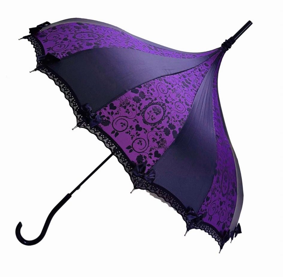 Purple Rose Parasol / Umbrella design… Rain or Shine! These beautiful parasols double as functional umbrellas. They will keep you shady on those bright sunny days and dry on those dark and stormy nights. The retro pagoda shape, hooked handle and lace trim with tiny bows at each point make these umbrellas perfect for a Victorian costume or a fashion accessory that is sure to be admired everywhere you go. Each one is creatively themed, so it may be hard to choose just one!