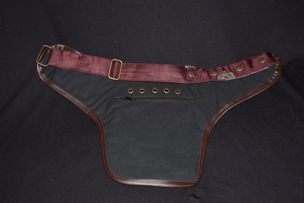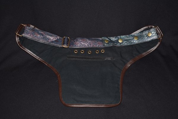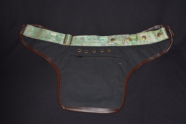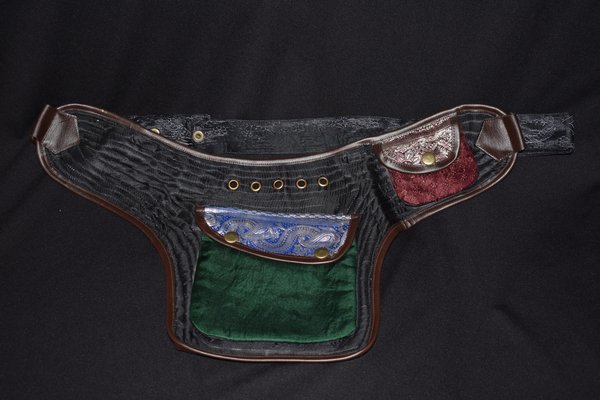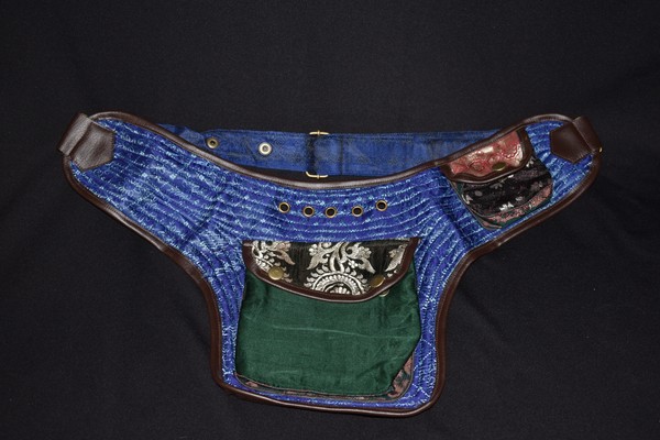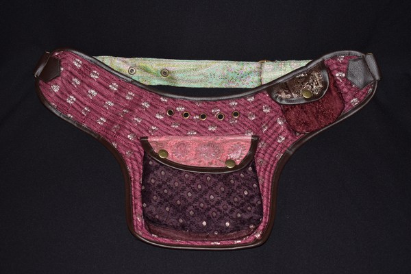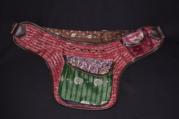 These belts are all so beautiful, it may be hard to choose just one. Quilted Silk brocade sari fabric is used to create an amazing collage of color and design. Vivid colors and metallic threads make it a great accent piece for your outfits. Each one of these belts is a one-of-a-kind masterpiece. Beautiful and PRACTICAL? Definitely! These belts have 2 pockets on the outside: a large 6 1/2″x6 1/2″, and a small 3″x3 1/2″ . Wait, There’s More! There is a “hidden” zipper pocket on the inside of the belt to keep those extra valuable things safe. The inside zipper pocket measures approx 6″x7 1/2″.What about the very important question … Will it fit me? This belt has adjustable snaps and a system of ring adjustments to help it fit a large range of sizes. This belt design adjusts from 38″ to 52″. Need a smaller size? Try our 3 pocket belt style or, if you are enthralled by one of this style and have a basic knowledge of sewing, the belt strap would be easy to shorten all the way down to around 28″.