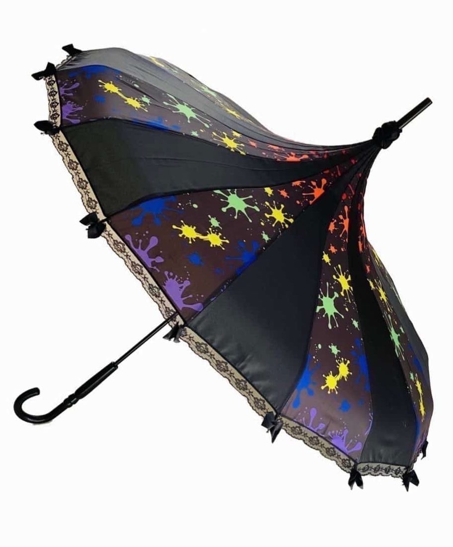 Rain or Shine! These beautiful parasols double as functional umbrellas. They will keep you shady on those bright sunny days and dry on those dark and stormy nights. The retro pagoda shape, hooked handle and lace trim with tiny bows at each point make these umbrellas perfect for a Victorian costume or a fashion accessory that is sure to be admired everywhere you go. Each one is creatively themed, so it may be hard to choose just one!