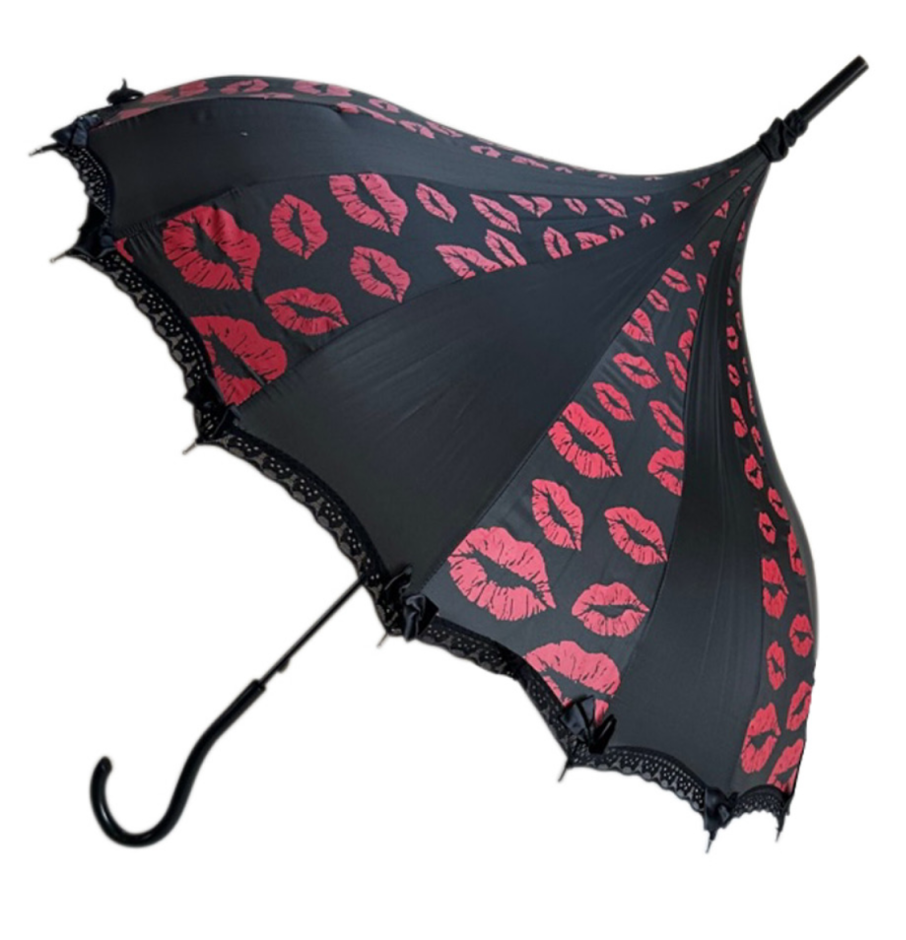 Red Kisses Parasol / Umbrella design… Rain or Shine! These beautiful parasols double as functional umbrellas. They will keep you shady on those bright sunny days and dry on those dark and stormy nights. The retro pagoda shape, hooked handle and lace trim with tiny bows at each point make these umbrellas perfect for a Victorian costume or a fashion accessory that is sure to be admired everywhere you go. Each one is creatively themed, so it may be hard to choose just one!