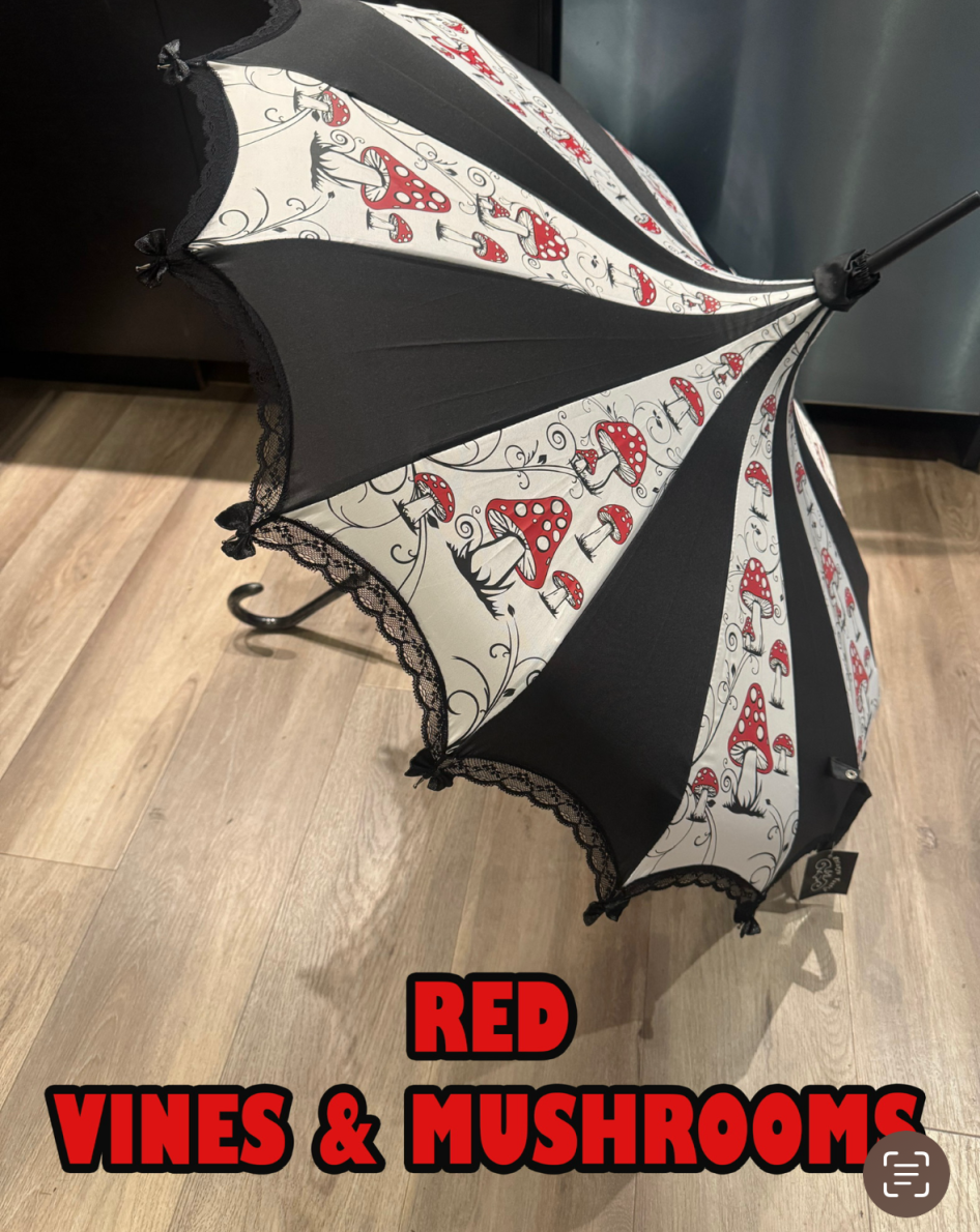 Red Mushroom Parasol / Umbrella design… Rain or Shine! These beautiful parasols double as functional umbrellas. They will keep you shady on those bright sunny days and dry on those dark and stormy nights. The retro pagoda shape, hooked handle and lace trim with tiny bows at each point make these umbrellas perfect for a Victorian costume or a fashion accessory that is sure to be admired everywhere you go. Each one is creatively themed, so it may be hard to choose just one!