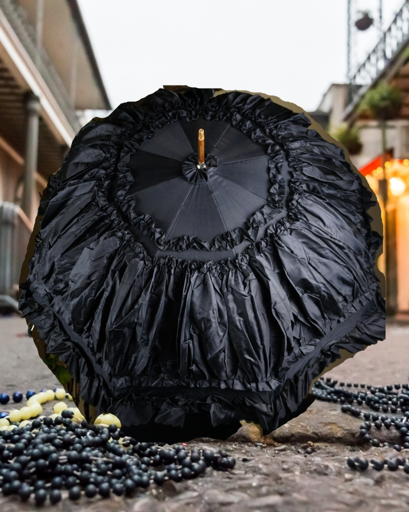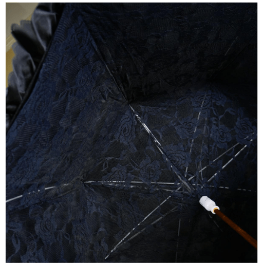 Black Ruffle with lace interior Parasol / Umbrella These beautiful parasols double as functional umbrellas. They will keep you shady on those bright sunny days and dry on those dark and stormy nights. The retro pagoda shape, hooked handle and lace trim with tiny bows at each point make these umbrellas perfect