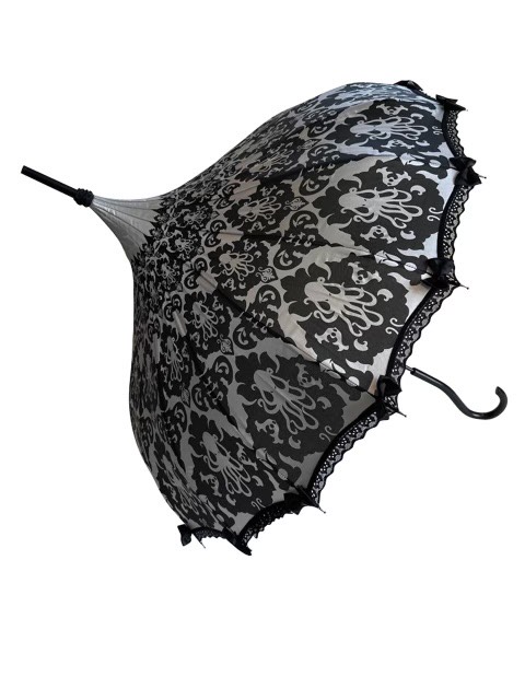 Silver Octopus Damask Parasol This parasol is a fun and functional accessory. It shields you from sun and rain with its metal frame and waterproof fabric. It has a pagoda shape, a hooked handle, and a lace trim with bows. It comes in different themes to match your style. It is sturdy and portable, making it a smart and beautiful choice.