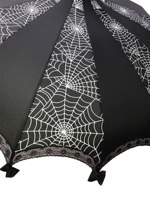 Spider Webs Parasol Umbrella These beautiful parasols double as functional rain or shine umbrellas. They will keep you shady on those bright sunny days and dry on those dark and stormy nights. The retro pagoda shape, hooked handle and lace trim with tiny bows at each point make these umbrellas perfect