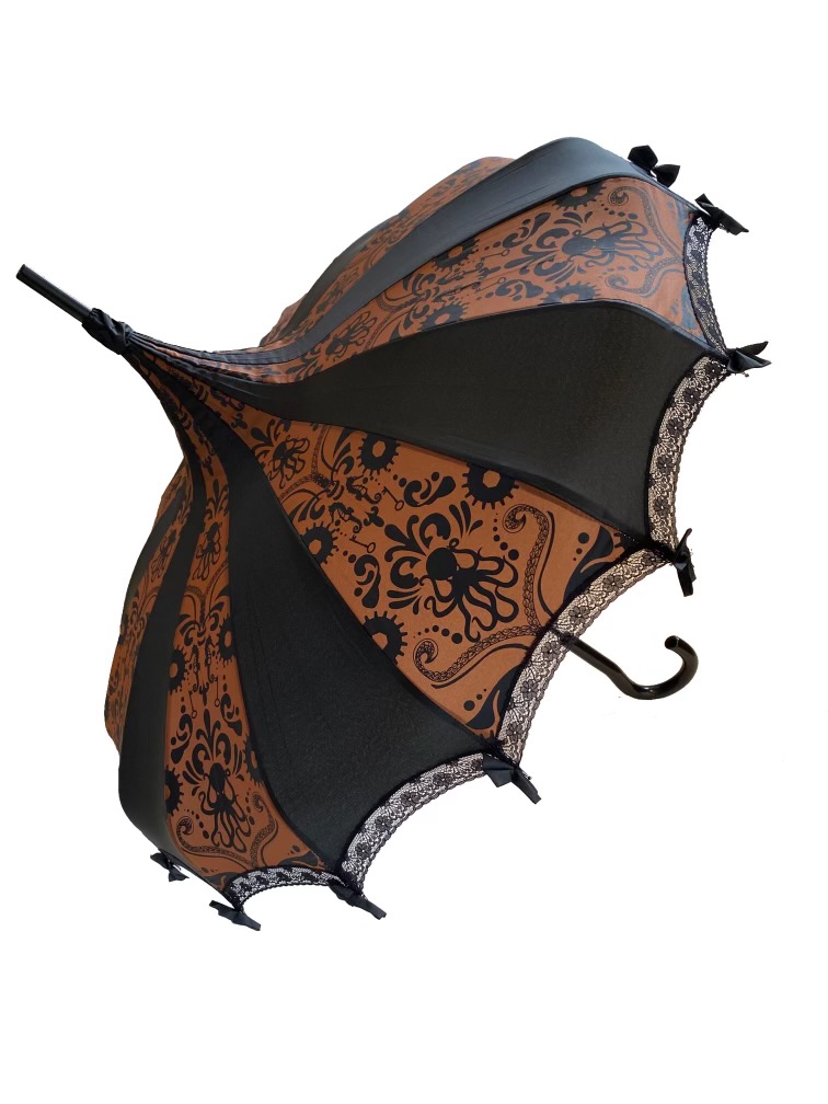Rain or Shine! These beautiful parasols double as functional umbrellas. They will keep you shady on those bright sunny days and dry on those dark and stormy nights. The retro pagoda shape, hooked handle and lace trim with tiny bows at each point make these umbrellas perfect for a Victorian costume or a fashion accessory that is sure to be admired everywhere you go. Each one is creatively themed, so it may be hard to choose just one!