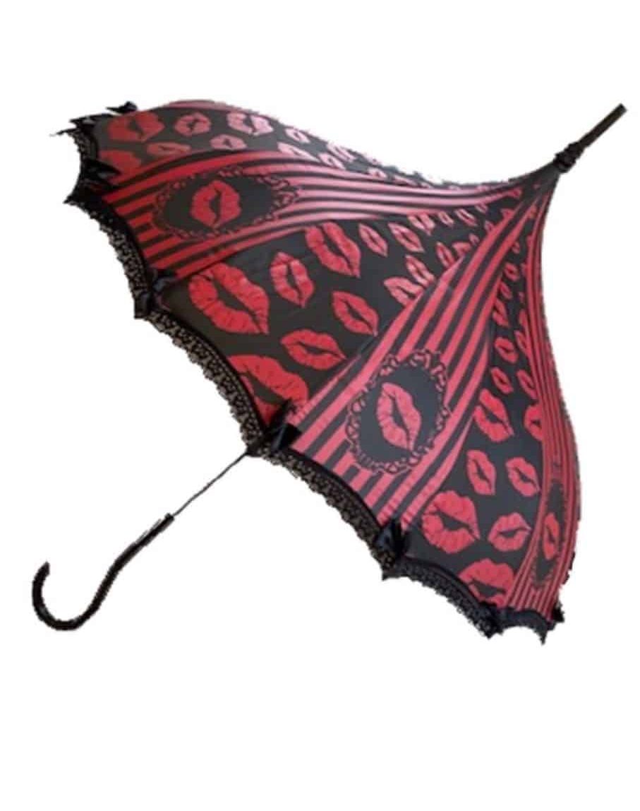 Stripes and Kisses Parasol / Umbrella design… Rain or Shine! These beautiful parasols double as functional umbrellas. They will keep you shady on those bright sunny days and dry on those dark and stormy nights. The retro pagoda shape, hooked handle and lace trim with tiny bows at each point make these umbrellas perfect for a Victorian costume or a fashion accessory that is sure to be admired everywhere you go. Each one is creatively themed, so it may be hard to choose just one!