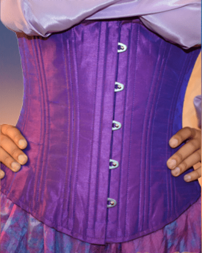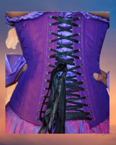 The outer layer of this corset is made from silk satin fabric in a violet purple.