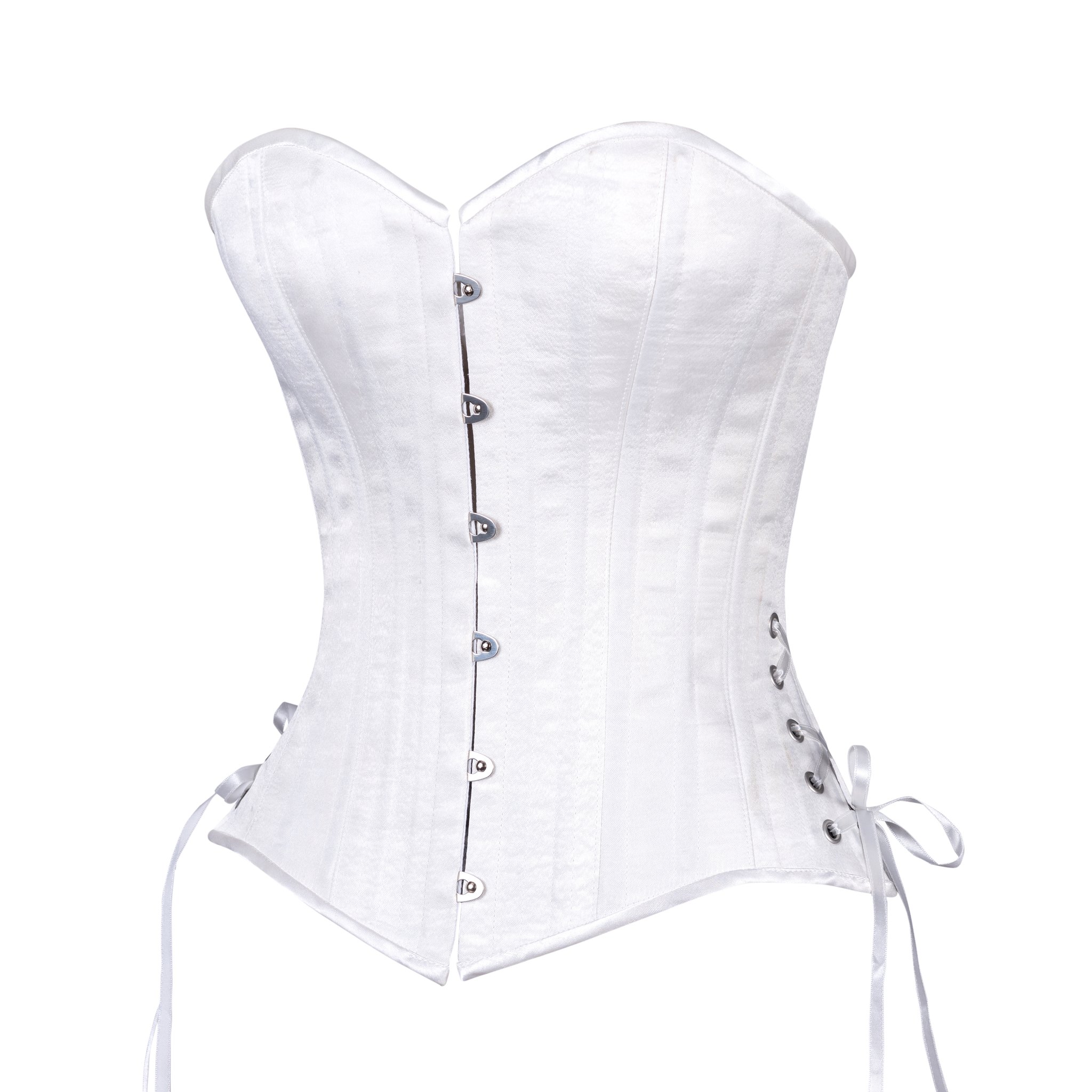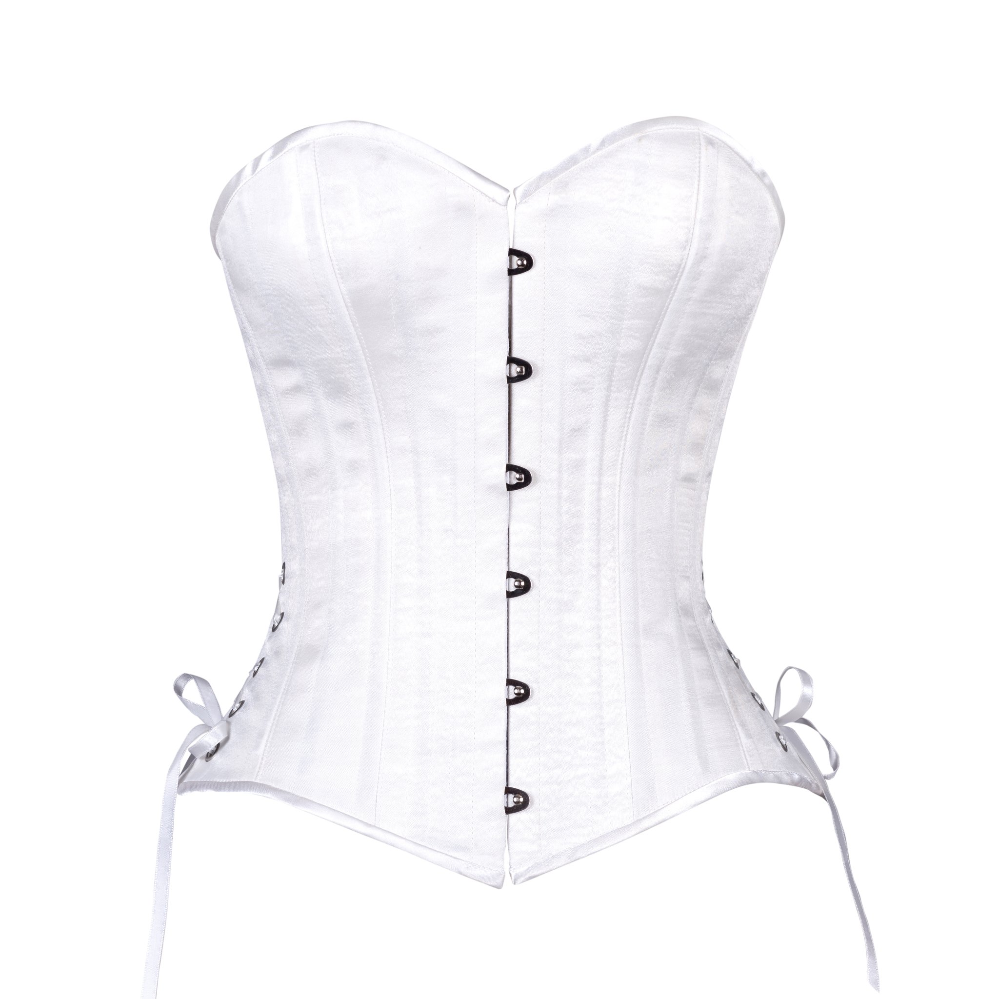 The outer layer of this corset is made from white satin.  Great under or over clothing. Perfect for every day or your special day.